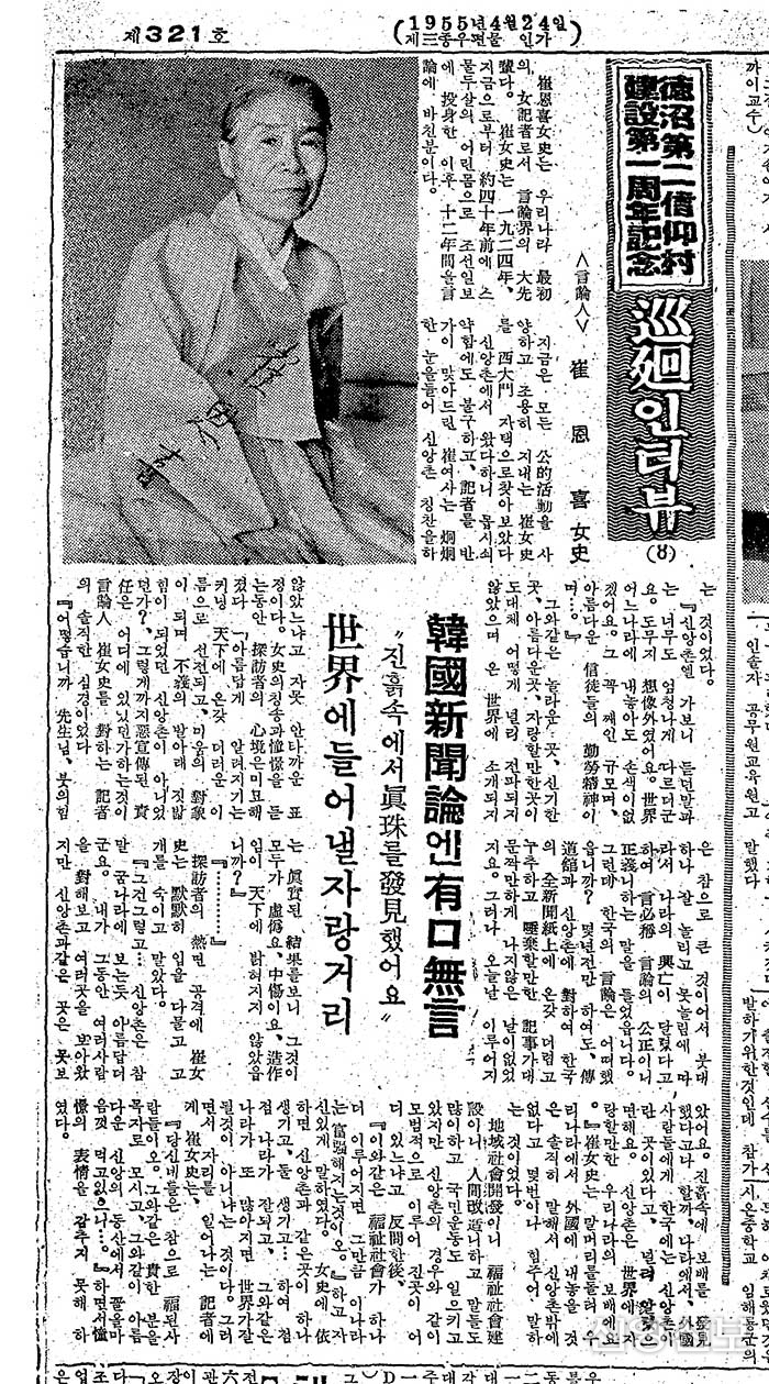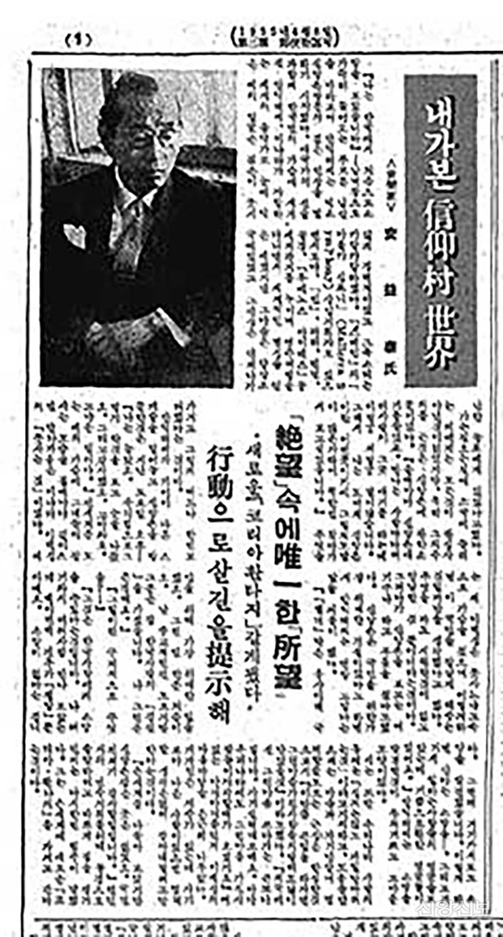 1963년 9월 23일자 신앙신보에 실린 우리나라 최초의 여성 기자 인터뷰. 그녀는 신앙촌을 “진흙 속에 진주 발견, 세계에 들어낼 자랑거리”라고 표현했다.