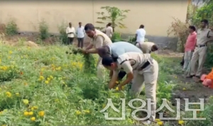 경찰이 꽃밭에 숨겨진 대마를 확인하고 있다. (출처: 인디아TV)