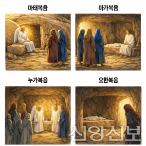 왼쪽의 그림은 빈 무덤에 방문 장면을 복음서 별로 비교한 것이다. 마태복음에선 천사가 돌문을 열어 그 위에 앉았지만, 다른 복음들에선 문이 이미 열려 있었고, 천사가 내부에 있거나, 존재하지 않았다. 목격한 여인의 수와 반응도 모두 다른데, 가장 먼저 쓰여진 마가의 여인들은 두려워서 아무에게도 말하지 못했다고 하는데, 마태의 여인들은 기쁜 마음으로 제자들에게 빈 무덤 사건을 알리러 간다.