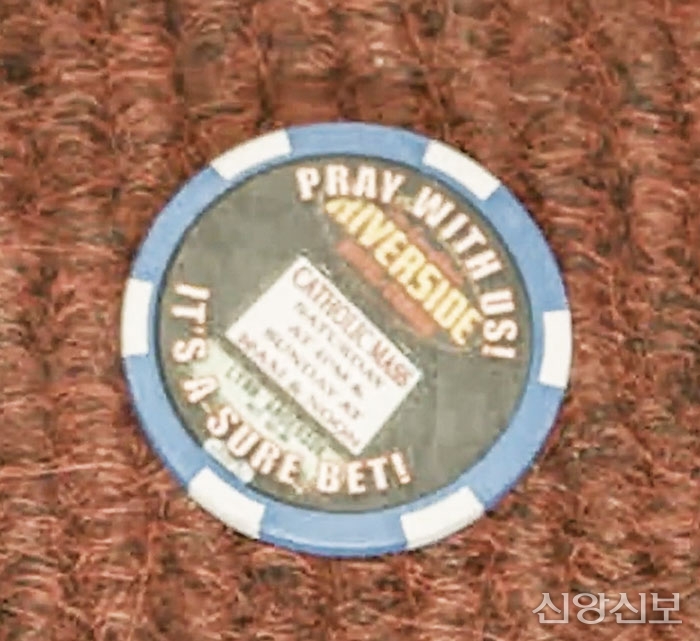 성 요한 세례자 가톨릭교회 기념품 샵에서 판매하는 칩에는 “우리랑 함께 기도하세요! 확실한 배팅입니다”라는 문구가 새겨져 있다.