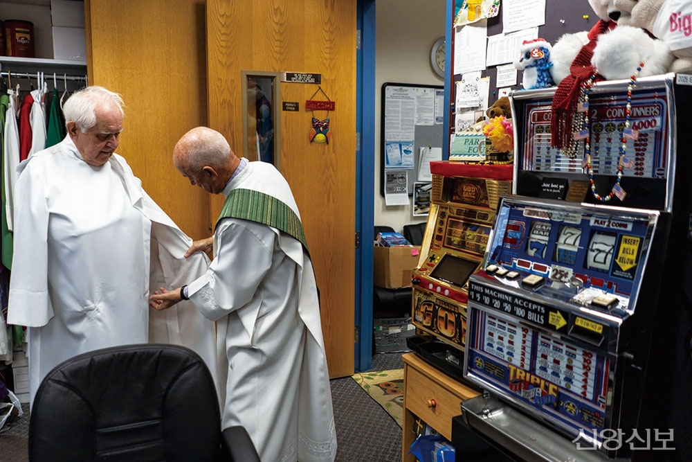 2019년 11월 10일, 네바다주 라플린에 있는 성 요한 세례자 가톨릭교회에서 일요일 아침 미사를 앞두고 찰스 어닉 신부가 사무실에서 리처드 램버트 부제의 도움을 받고 있다. (켄트 니시무라/로스앤젤레스 타임스/TNS) 그들 오른쪽에는 GOD GAME 슬롯머신이 있다.